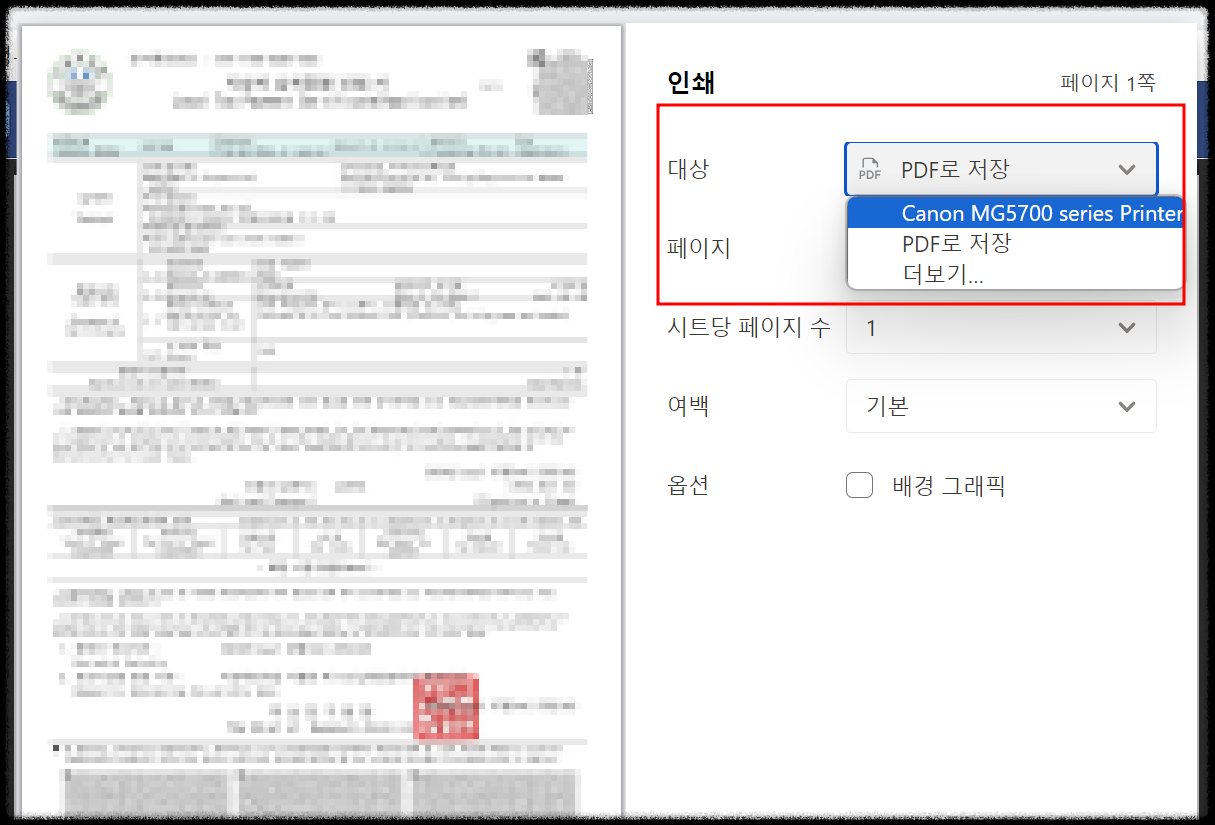 8. 지방세완납증명서를 출력하기 위해서는 위쪽 인쇄버튼을 누른 후 인쇄 대상에서 본인의 프린터기 기종을 선택 한 후 출력하기를 해주시면 됩니다. 문서로 저장하고 싶다면 PDF로 저장을 선택해 주시면 되겠죠.
