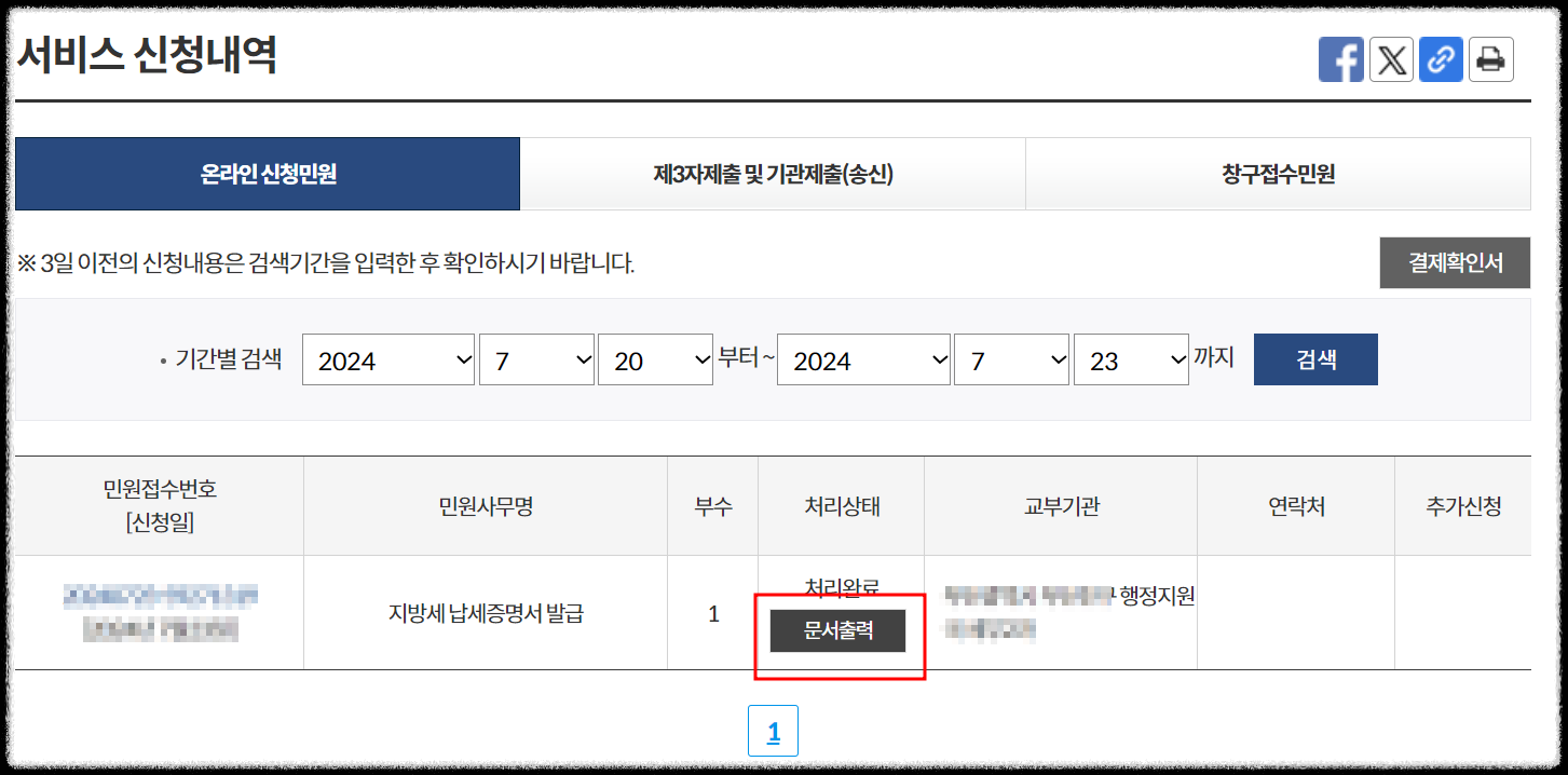 7. 지방세완납증명서 민원 신청이 정상적으로 처리되었네요. 이제 문서출력을 눌러 인쇄를 해 보겠습니다.