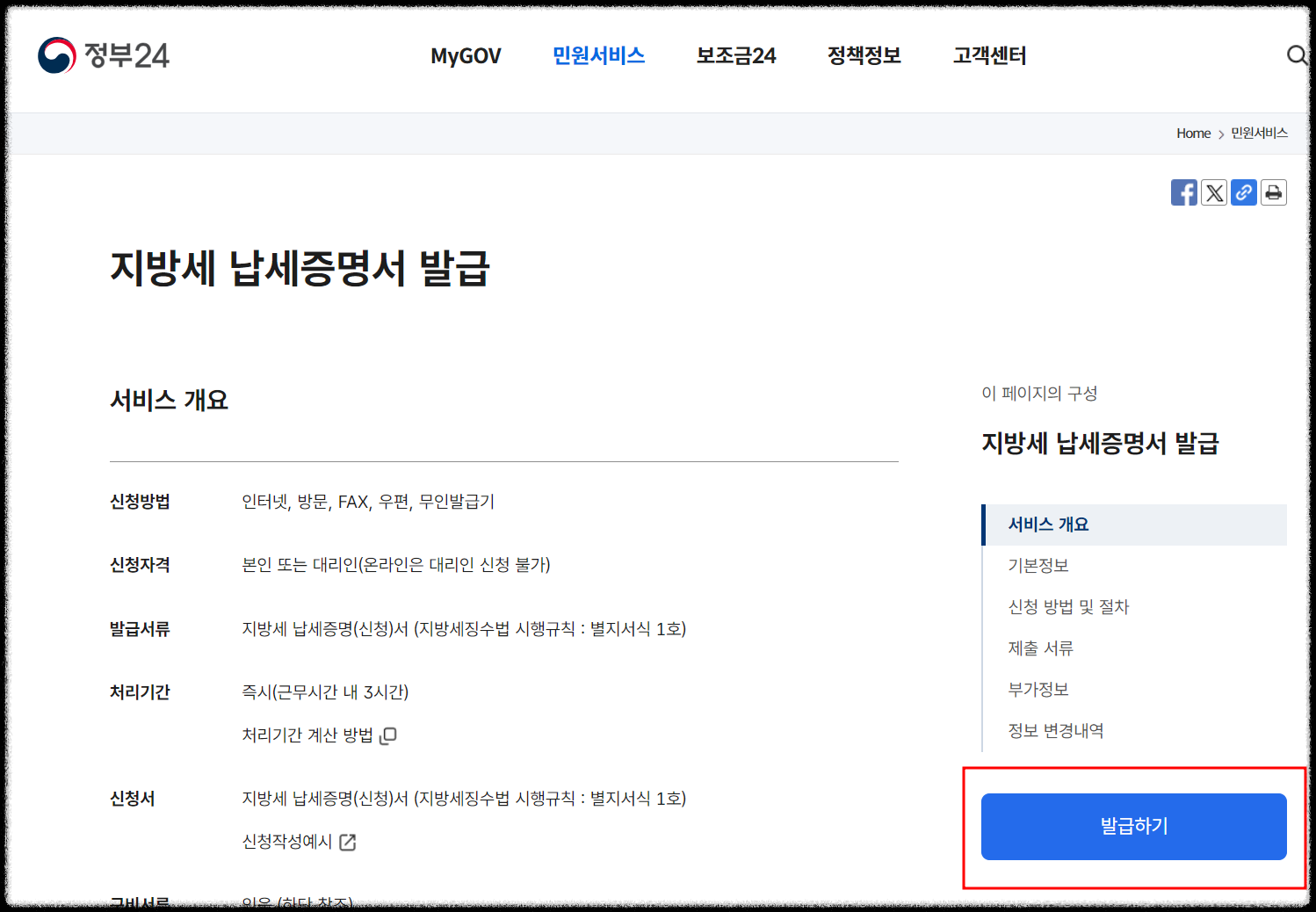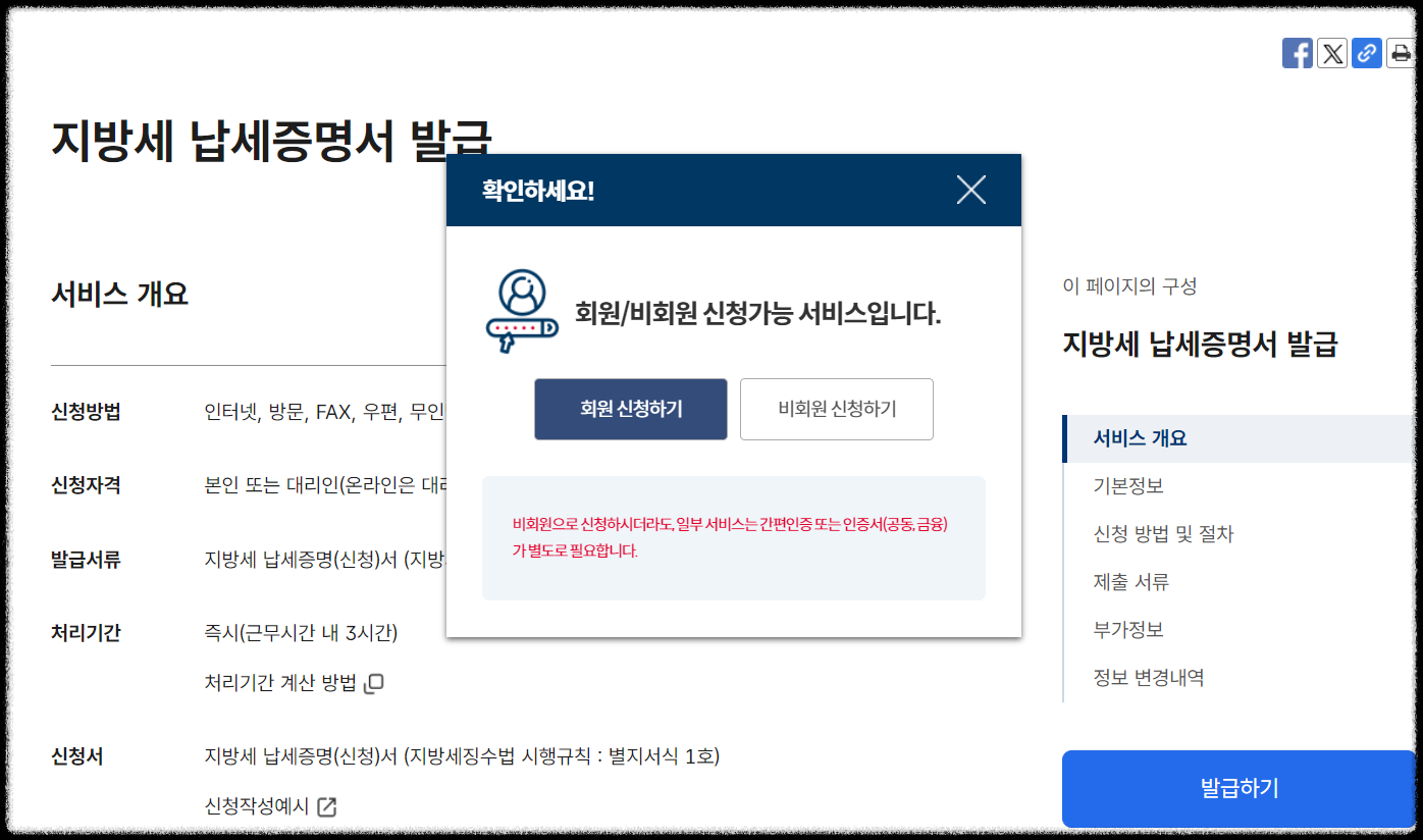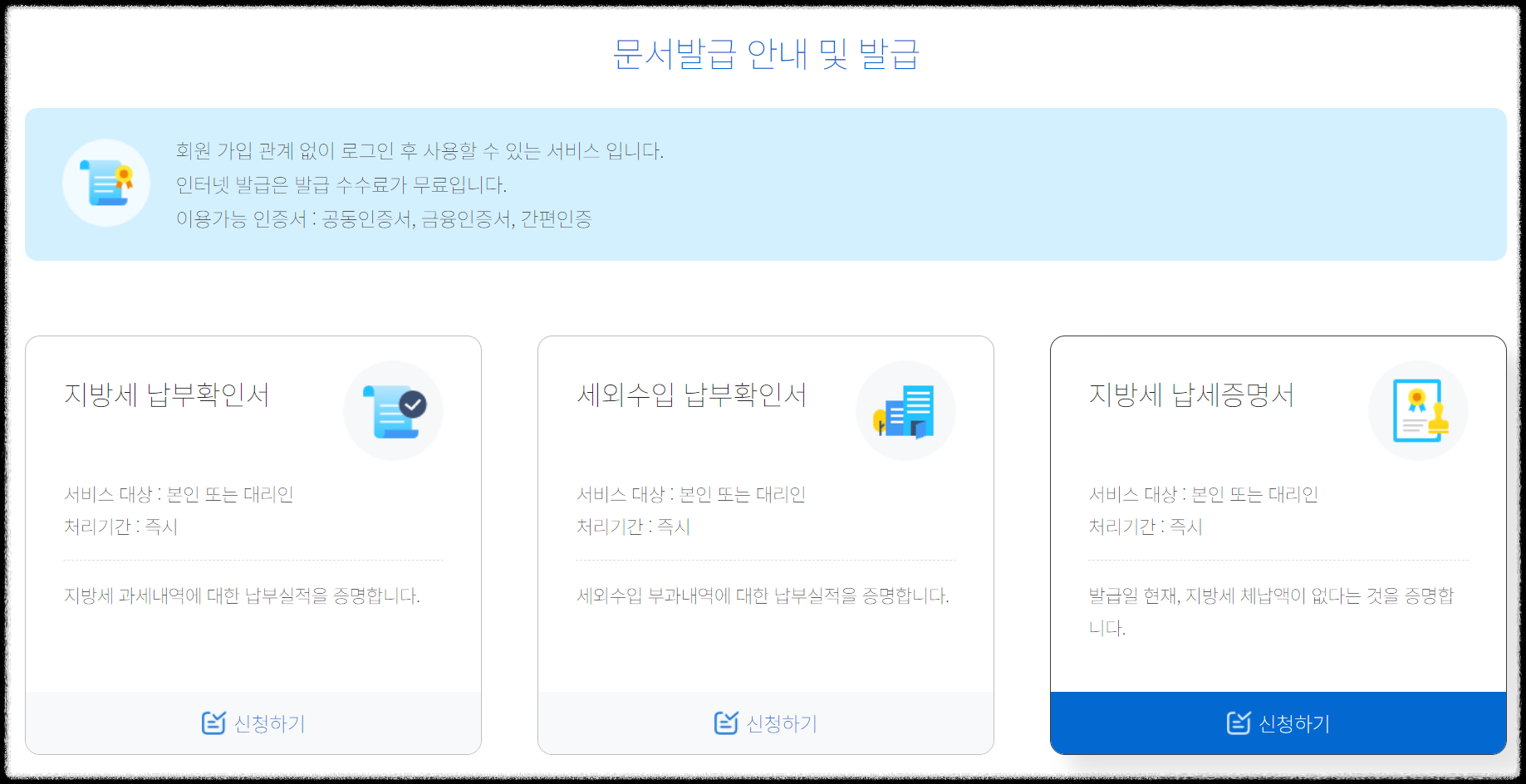 2. 지방세 납세증명서 발급에 관한 필요한 서류등 안내 사항 페이지가 나오는데요. 여기서 발급하기를 눌러줍니다