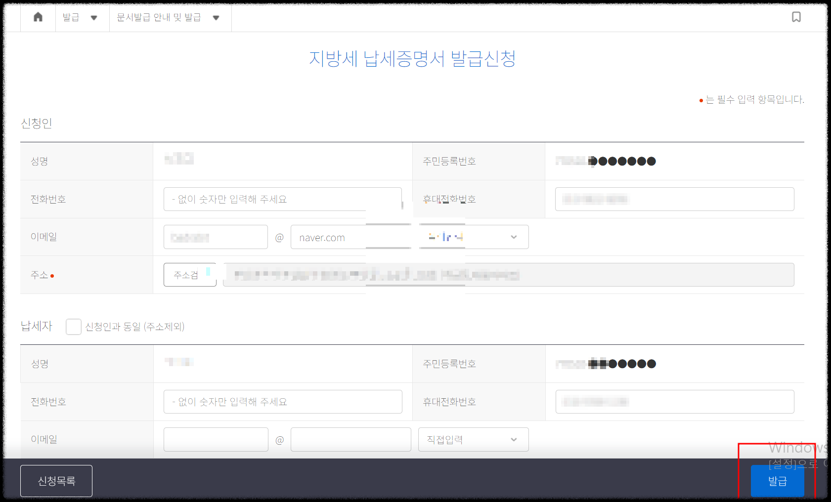 4. 지방세납세증명서를 발급받기 위해 개인정보를 입력해 줍니다. 빨간 점이 있는 곳은 빠짐없이 다 입력해 주셔야 해요.