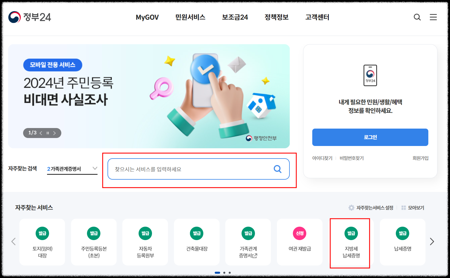 1. 정부24 홈페이지 입니다. 검색란에서 '지방세납세증명서' 라고 입력하거나 아래 자주찾는 서비스에서 '지방세납세증명'으로 들어갑니다.