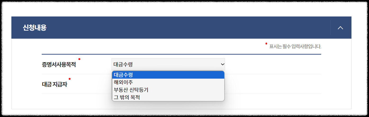 5. 증명서 사용목적에서는 대금수평, 해외이주, 부동산 신탁등기, 그밖의 목적을 정해줘야 하는데요. 대금수령의 경우 대금 지급자를 입력해야 하며, 해외이주시에도 해외이주에 관한 정보를 입력해야 합니다. 특별한 내용이 아니라면 사용목적에 그밖의 목적으로 선택하고 발급 목적을 간단하게 적어주시면 되겠죠.