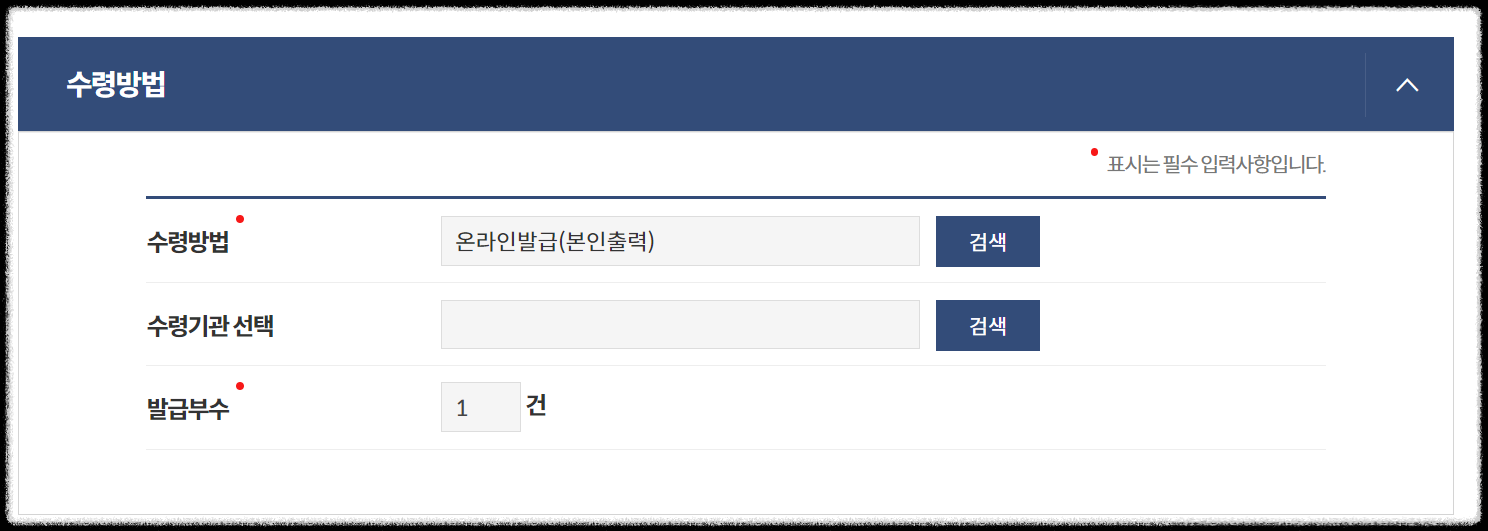 6. 수령방법은 온라인발급 본인출력, 전자문서지갑, 방문수령등을 선택할 수 있습니다. 직접 출력을 하고싶다면 온라인발급(본인출력)으로 선택 후 민원신청하기를 해줍니다.