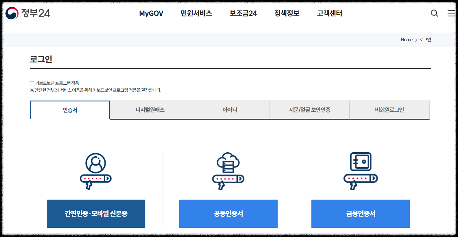 3. 공인인증서등을 통한 회원 로그인을 해줍니다.