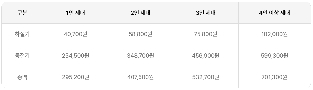 바우처 지원금액은 세대원 수를 고려해 세대당 금액을 차등지급합니다.