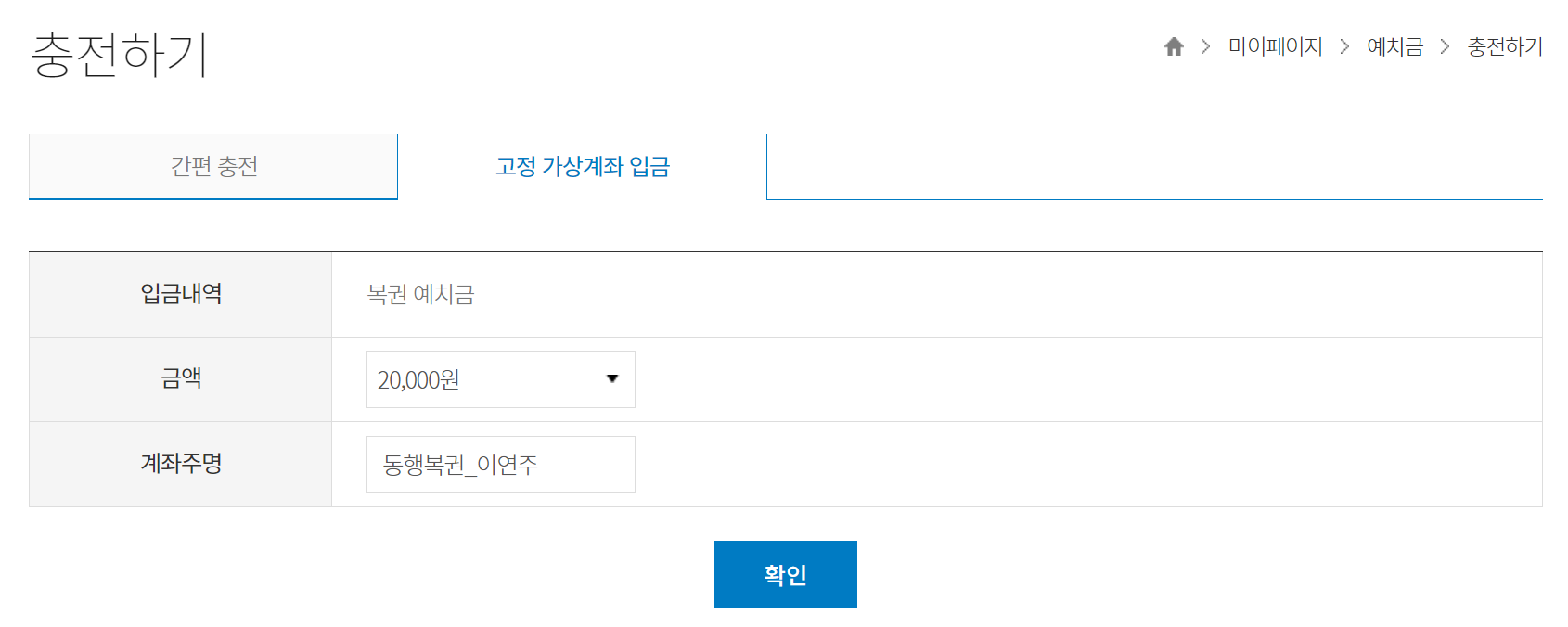 동행복권 사이트를 통해 케이뱅크 계좌를 이용해 간편충전하거나 고정가상계좌를 통해 예치금을 입금할 수 있습니다. 인터넷 복권을 구입할 수 있는 예치금 충전금액은 5,000원 ~ 1,000,000원까지 가능합니다.