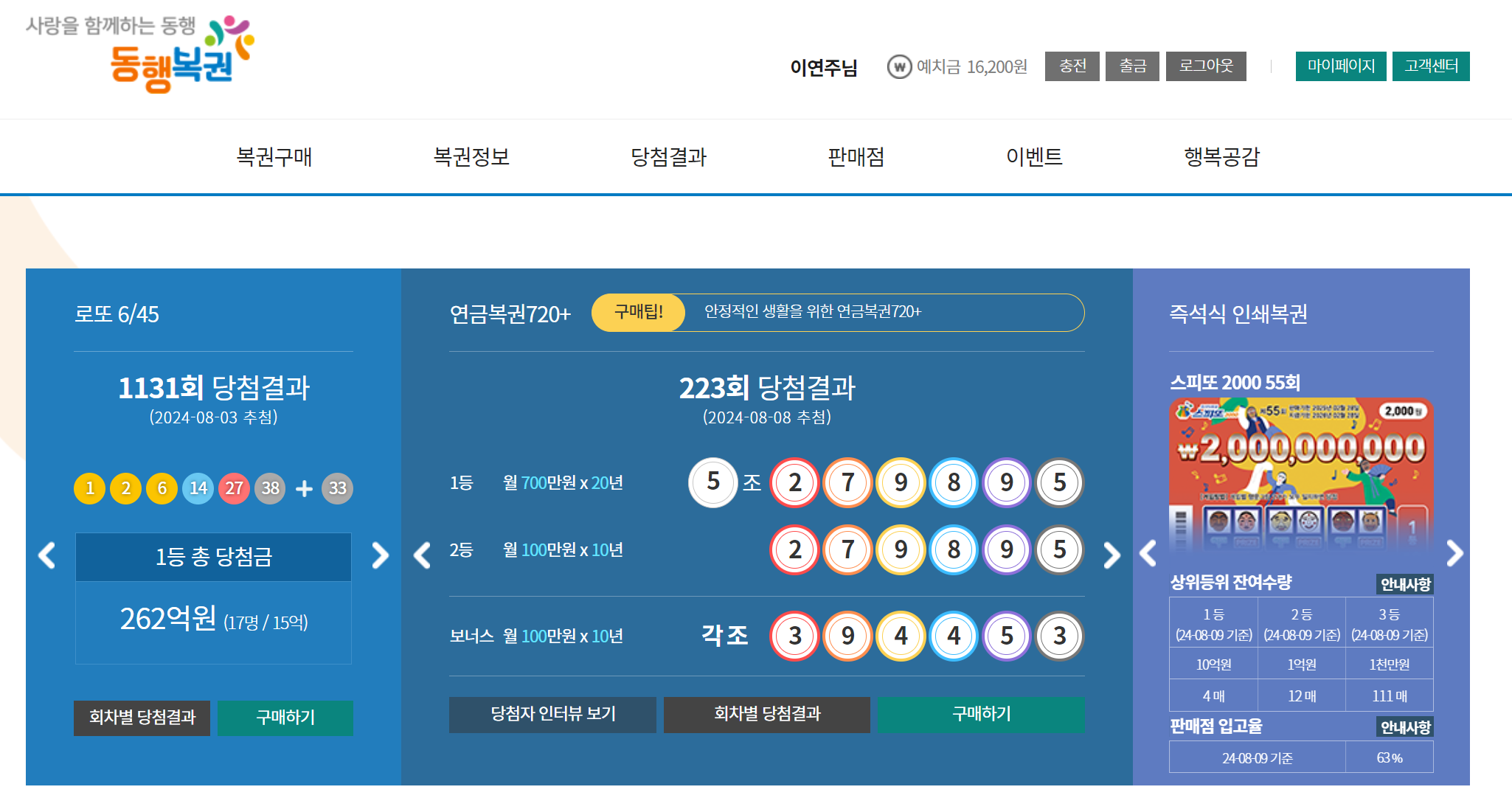 로또 구매 예치금 충전 내역, 복권 구매 사용 내역은 동행복권 마이페이지에서 확인할 수 있습니다.