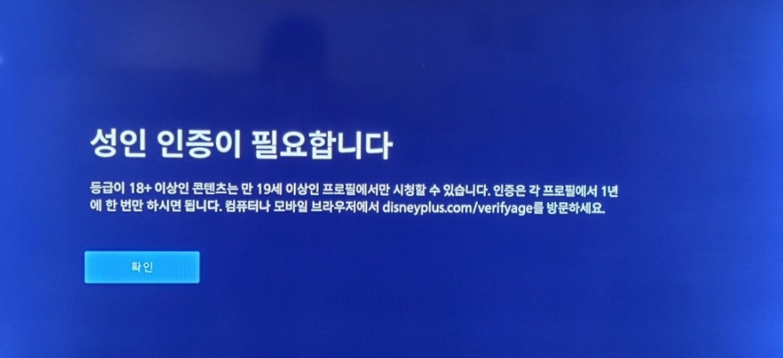 tv 로 디즈니를 시청하려고 하니 이런 안내화면이 뜹니다. 디즈니 플러스 는 18세 이상등급 영화를 보기 위해서는 19세 이상 성인 연령 인증을 해야 한다고 합니다.