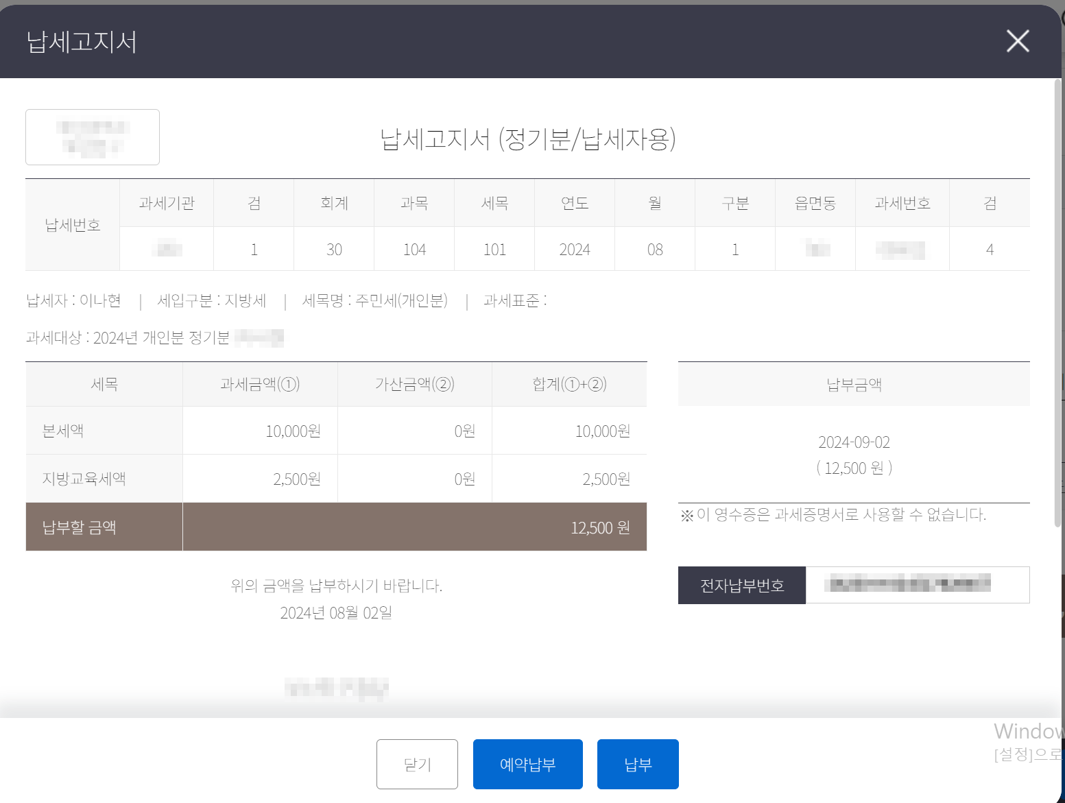 지방세 납부 기간은 2024년 9월 2일까지입니다. 납기 기간을 넘기면 납부지연가산세가 추가 되니 꼭 납기내에 납부하세요.
