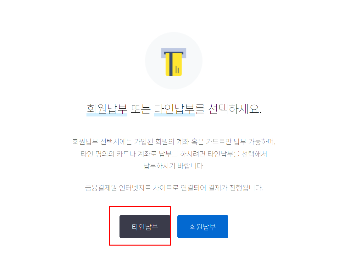 6. 회원납부 또는 타인납부 인지 물어보는데요.