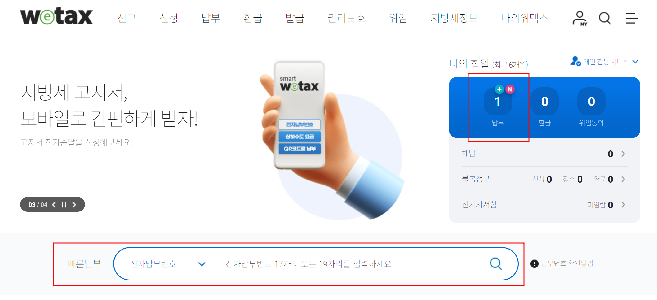 3. 지로용지의 전자납부번호를 입력하거나 오른쪽 위 나의할일에서 납부 (1) 되어 있는 부분을 클릭해 줍니다.