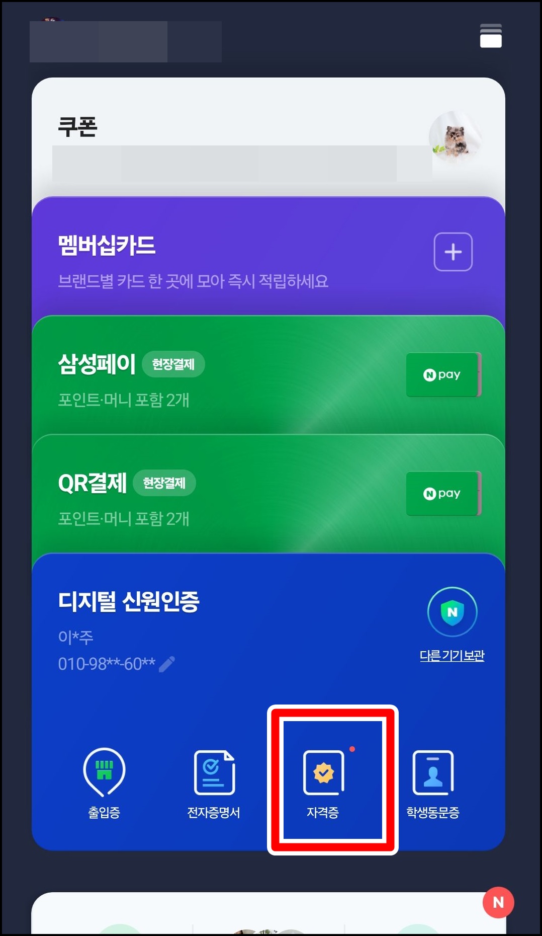2. 나오는 화면에서 쭉 내려보면 [디지털 신원인증] 이라는 카드 메뉴 보이는 데요. 여기서 [자격증]을 클릭합니다.