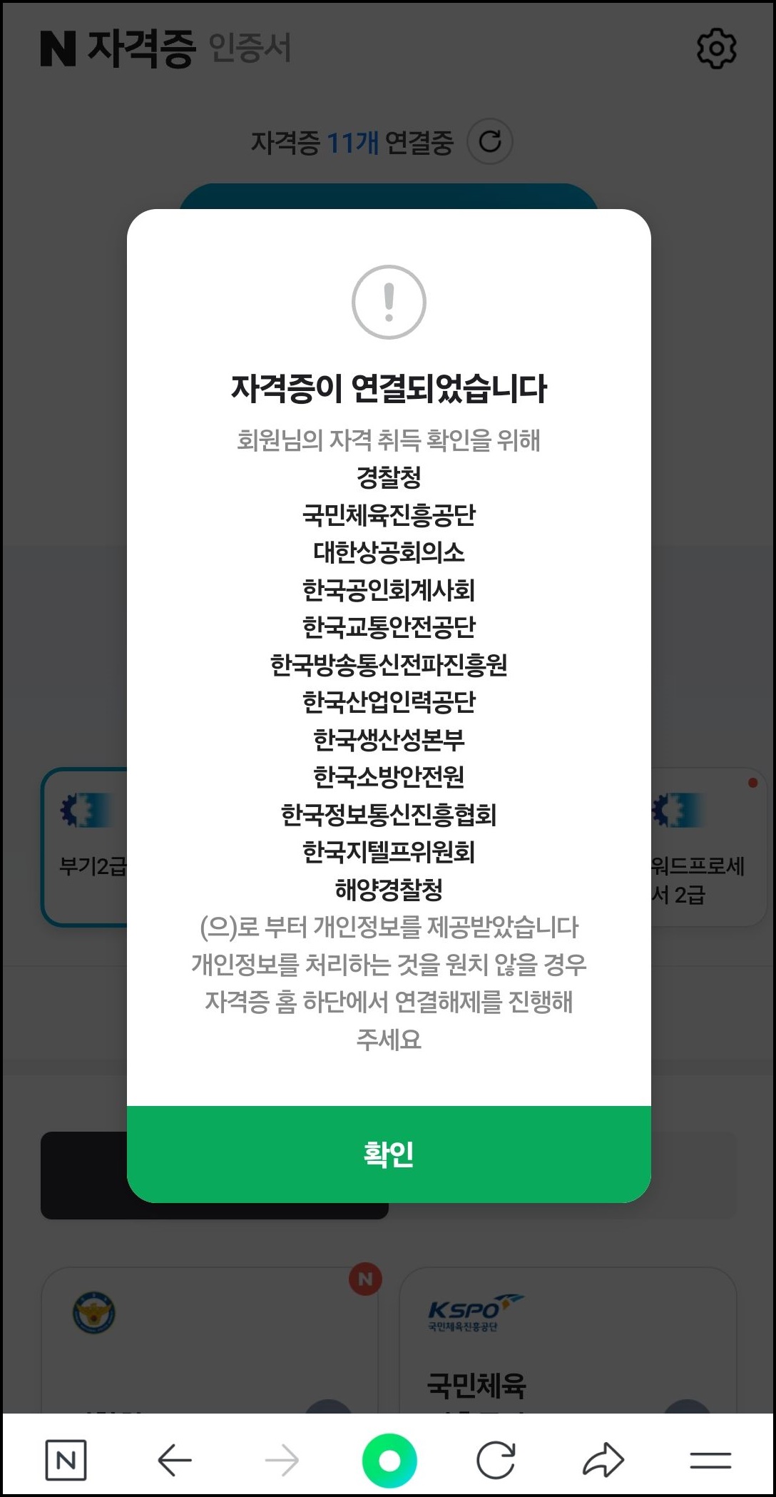 6. 내 모든 자격증 연결이 완료되었습니다. 국가기술자격증 취득 정보를 이제 쉽게 확인 할 수 있게 되었네요