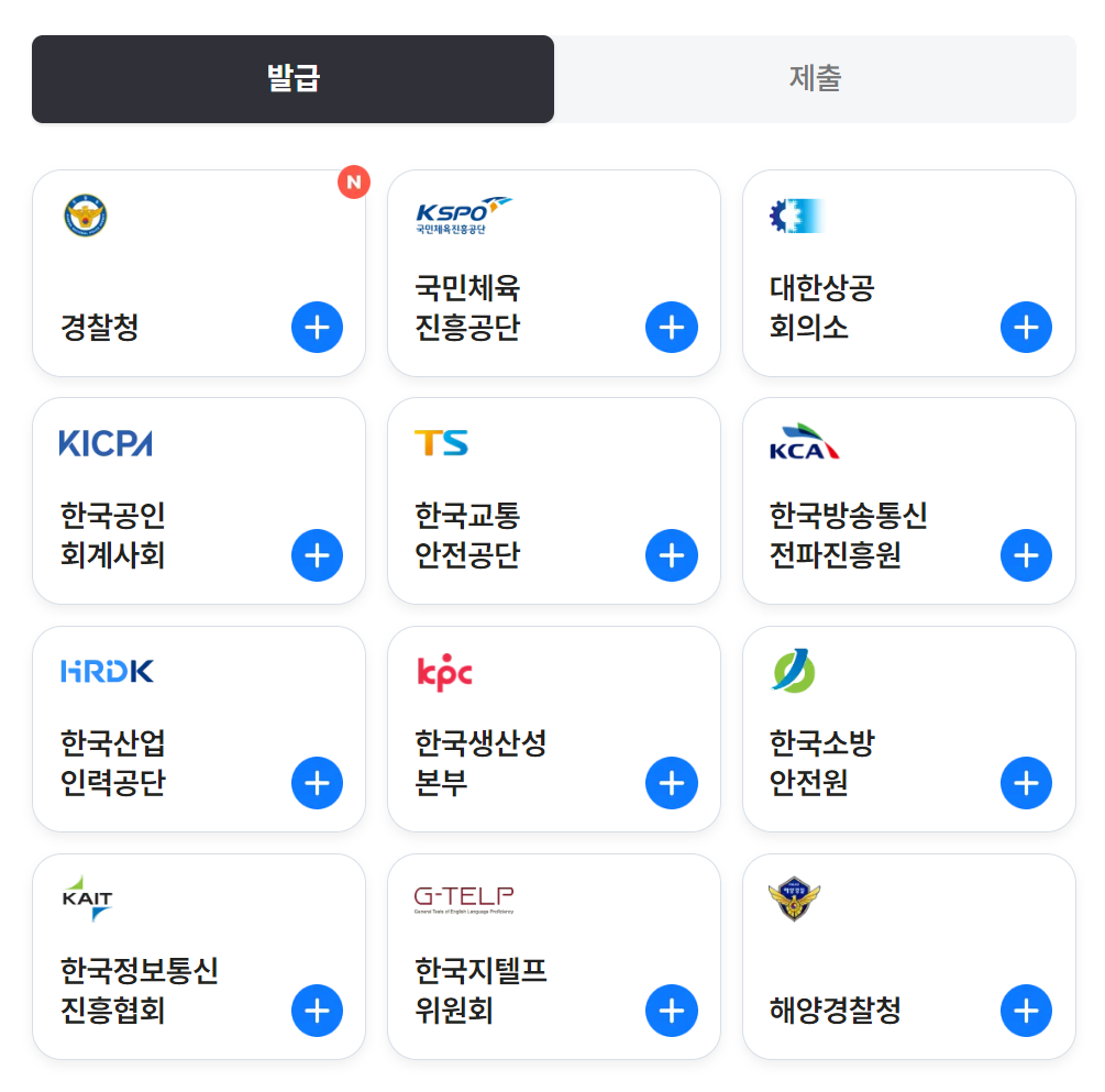 네이버 자격증 조회를 통해 발급 가능한 자격증은 경찰청, 국민체육진흥공단, 대한상공회의소, 한국산업인력 공단등 12개 입니다.