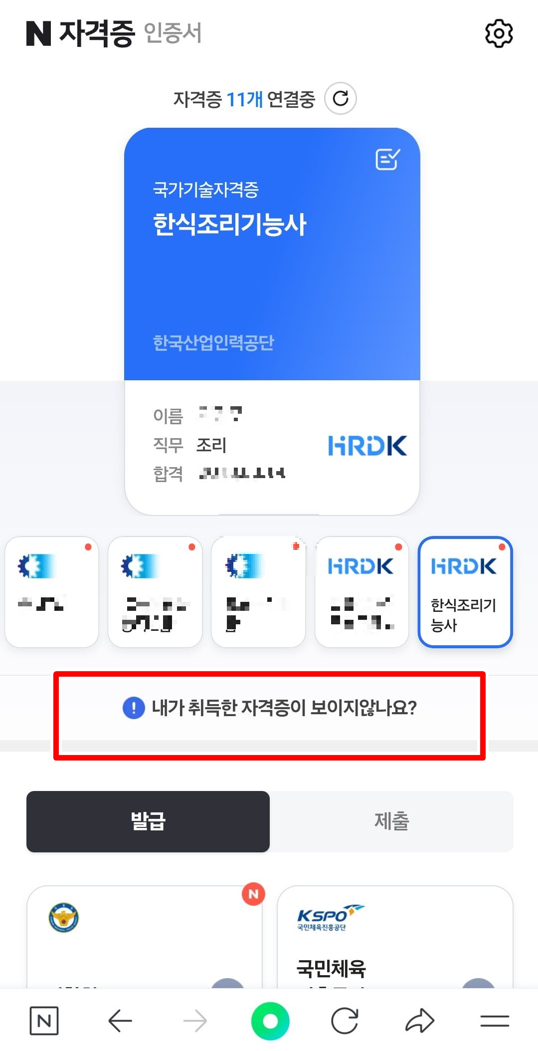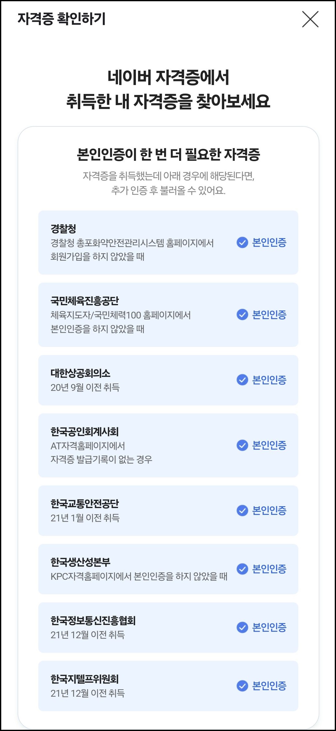 1. 자격증 확인 화면에서 [내가 취득한 자격증이 보이지않나요?] 메뉴로 들어가보면 본인 인증이 한번더 필요한 자격증이 나옵니다.