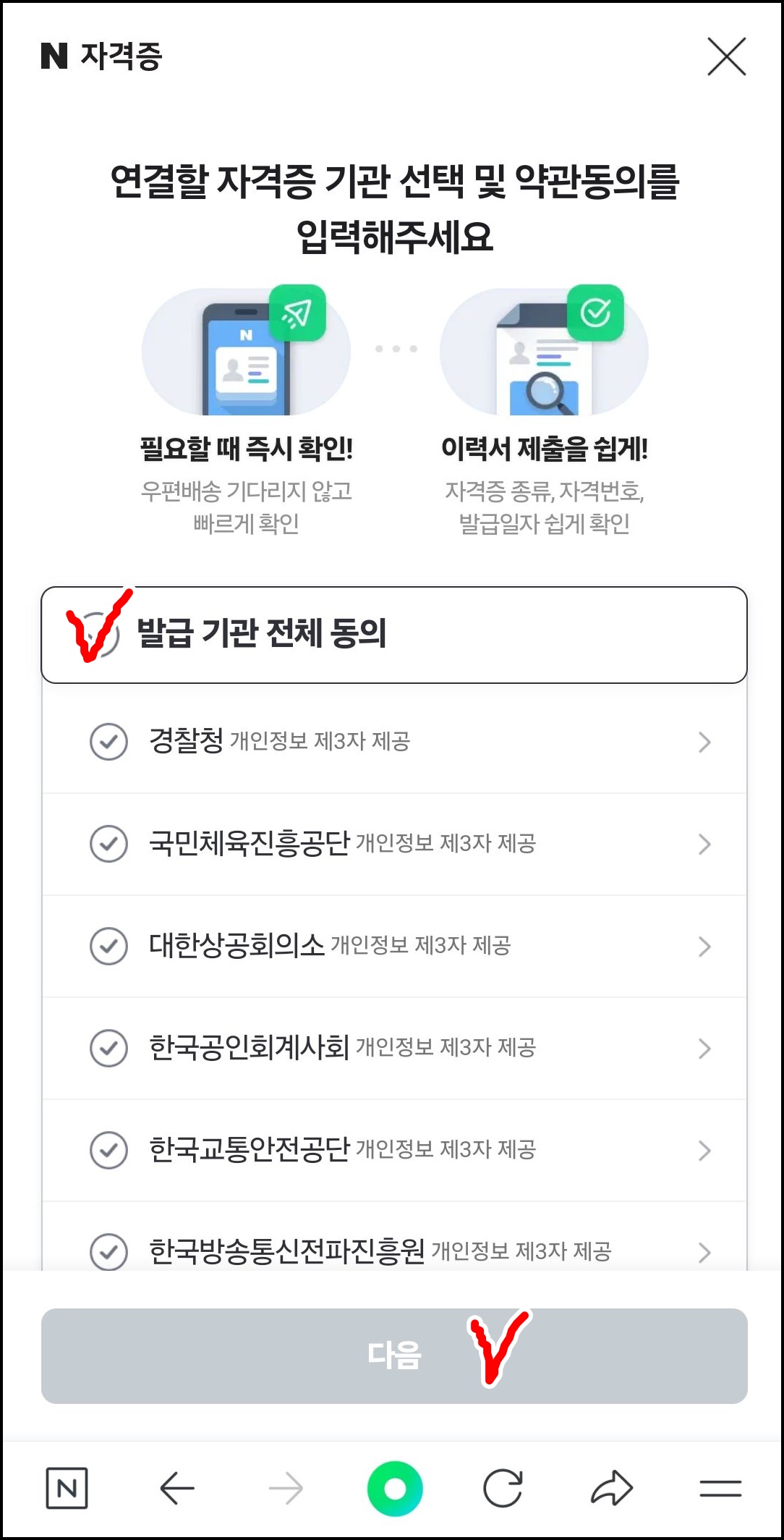 4. 연결할 자격증 기관을 선택하고 약관에 동의 하면 되는데요. [발급기관 전체 동의]를 해주시면 조회할 수 있는 국내 인증 모든 자격증 조회할 수 있게됩니다.