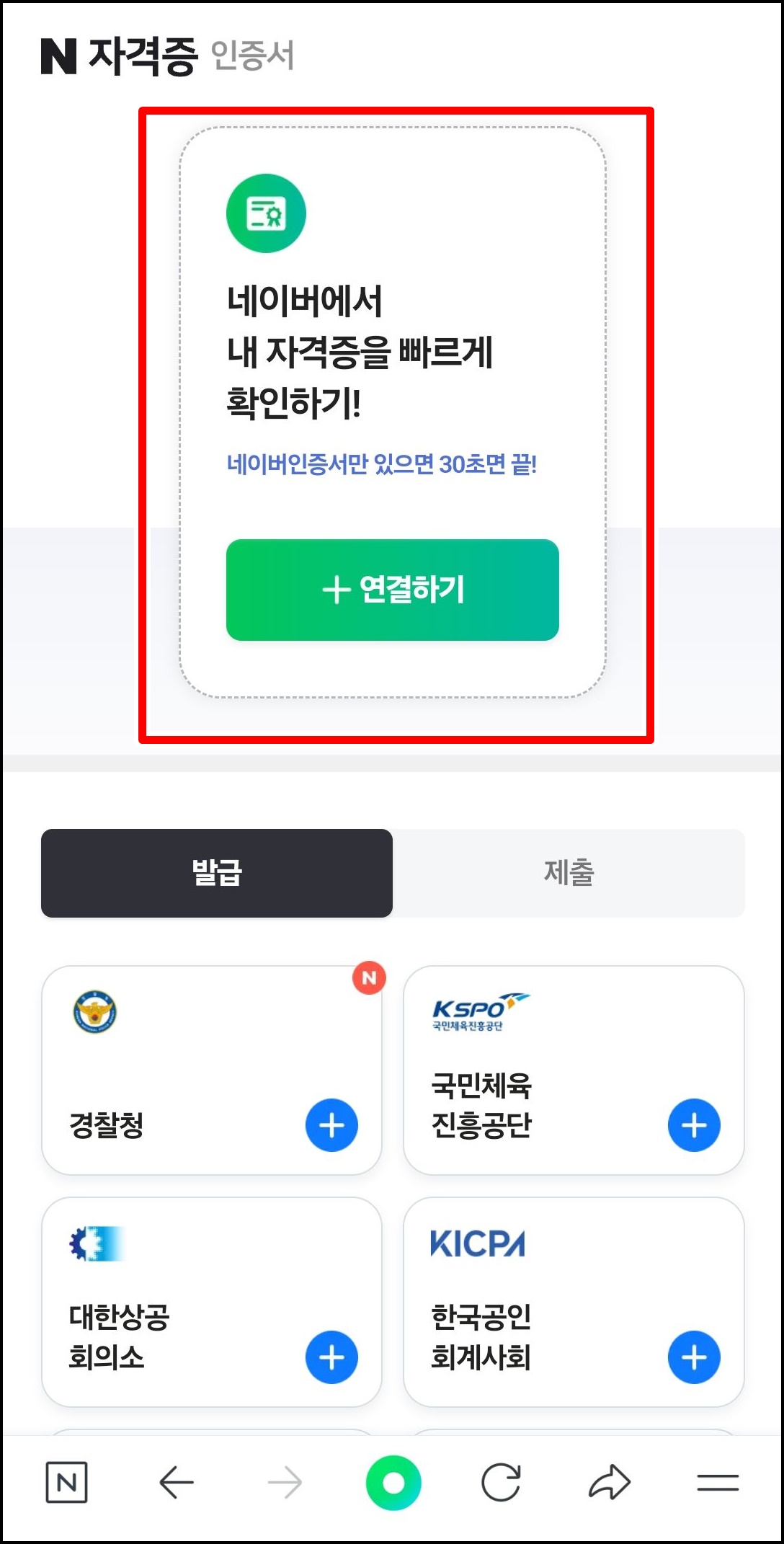 3. 자격증 화면이 나오죠. '네이버에서 내 자격증을 빠르게 확인하기" + [연결하기] 눌러줍니다.