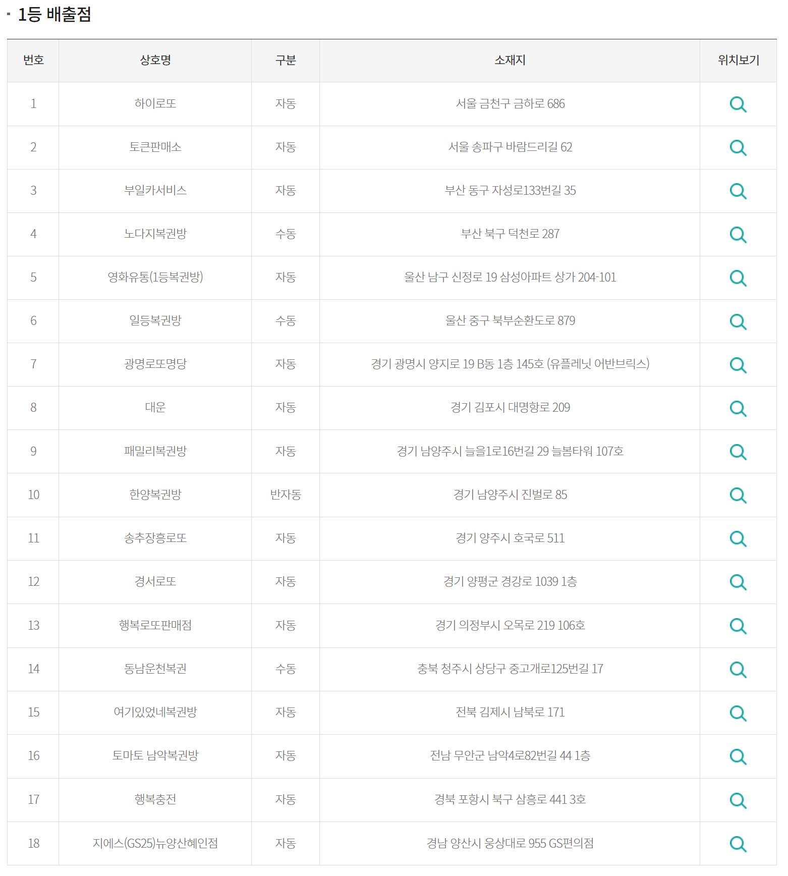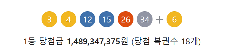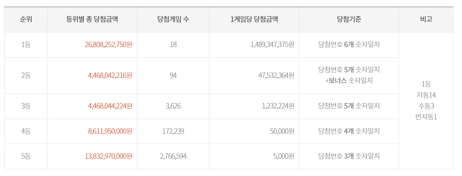 - 1등 당첨자 수: 18명 각 당첨금: 14억 8,934만 원 자동 구매: 14명, 수동 3명, 반자동 1명