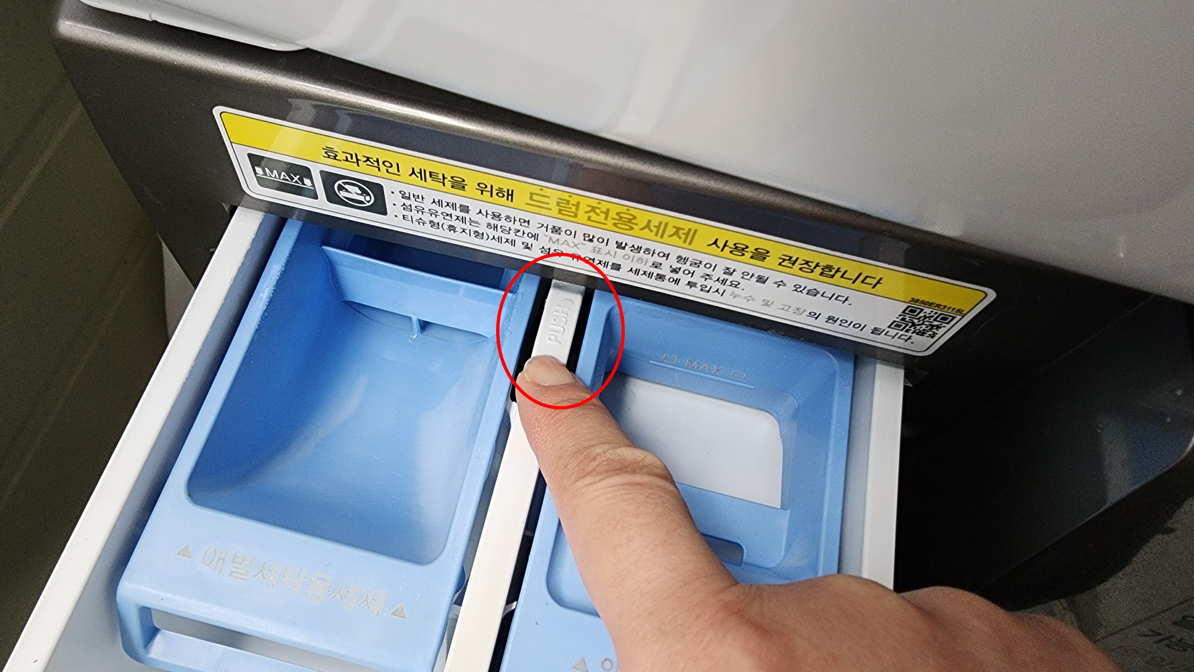 세탁기 세제통은 쉽게 분리할 수 있습니다. 통 안쪽에 push 부분을 꾹 눌러 앞으로 당기면 쉽게 빠지는데요. 세제통도 곰팡이가 피기 쉬우니 깨끗이 청소합니다.